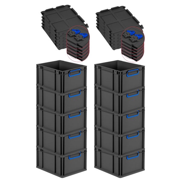 PROREGAL SuperSparSet 10x Eurobox NextGen Color mit Scharnierdeckel und Schiebeschnappverschlüssen, HxBxT 22x30x40cm, 20 Liter, Schwarz, Griffe blau geschlossen, Eurobehälter, Transportbox, Transportbehälter, Stapelbehälter