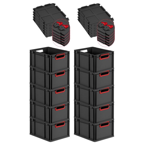 PROREGAL SuperSparSet 10x Eurobox NextGen Color mit Scharnierdeckel und Schiebeschnappverschlüssen, HxBxT 22x30x40cm, 20 Liter, Schwarz, Griffe rot offen, Eurobehälter, Transportbox, Transportbehälter, Stapelbehälter