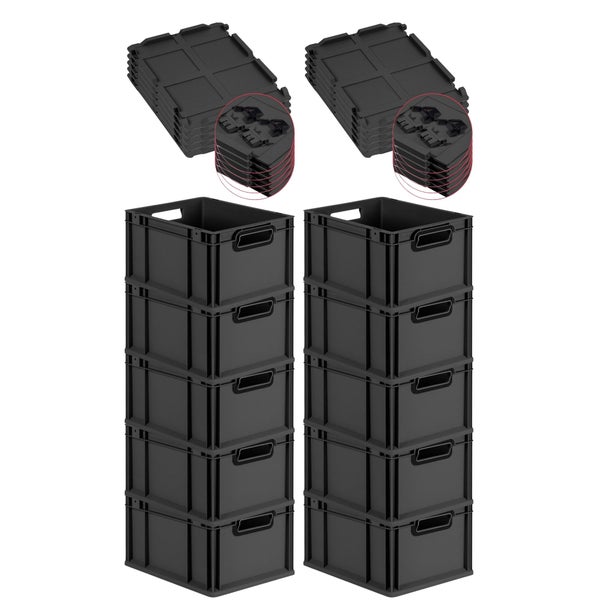 PROREGAL SuperSparSet 10x Eurobox NextGen Color mit Scharnierdeckel und Schiebeschnappverschlüssen, HxBxT 22x30x40cm, 20 Liter, Schwarz, Griffe schwarz offen, Eurobehälter, Transportbox, Transportbehälter, Stapelbehälter