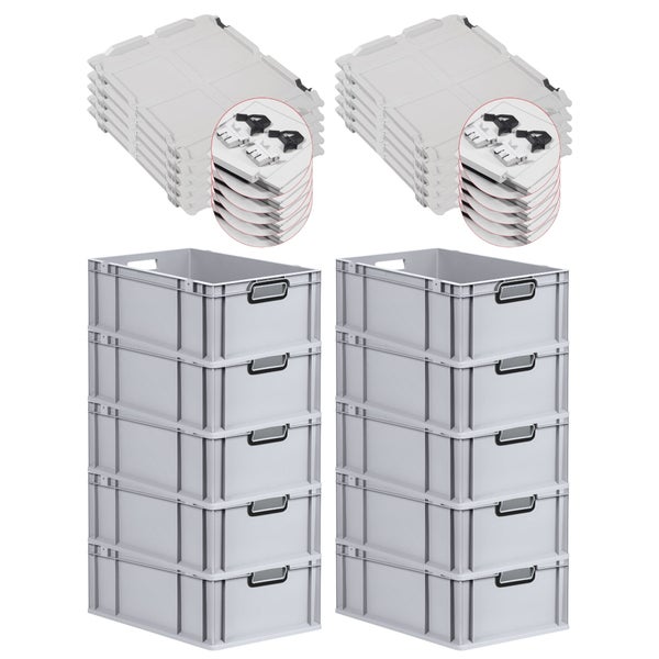 PROREGAL SuperSparSet 10x Eurobox NextGen Color mit Scharnierdeckel und Schiebeschnappverschlüssen, HxBxT 22x40x60cm, 44 Liter, Grau, Griffe schwarz offen, Verstärkter Boden, Eurobehälter, Transportbox, Transportbehälter, Stapelbehälter