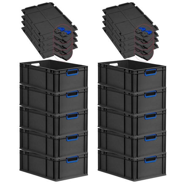 PROREGAL SuperSparSet 10x Eurobox NextGen Color mit Scharnierdeckel und Schiebeschnappverschlüssen, HxBxT 22x40x60cm, 44 Liter, Schwarz, Griffe blau offen, Verstärkter Boden, Eurobehälter, Transportbox, Transportbehälter, Stapelbehälter