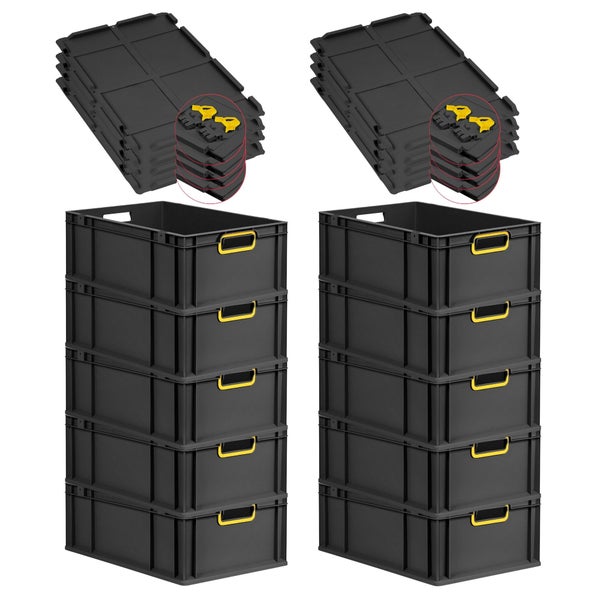 PROREGAL SuperSparSet 10x Eurobox NextGen Color mit Scharnierdeckel und Schiebeschnappverschlüssen, HxBxT 22x40x60cm, 44 Liter, Schwarz, Griffe gelb offen, Verstärkter Boden, Eurobehälter, Transportbox, Transportbehälter, Stapelbehälter