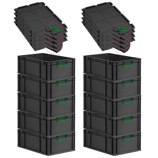 PROREGAL SuperSparSet 10x Eurobox NextGen Color mit Scharnierdeckel und Schiebeschnappverschlüssen, HxBxT 22x40x60cm, 44 Liter, Schwarz, Griffe grün geschlossen, Verstärkter Boden, Eurobehälter, Transportbox, Transportbehälter, Stapelbehälter