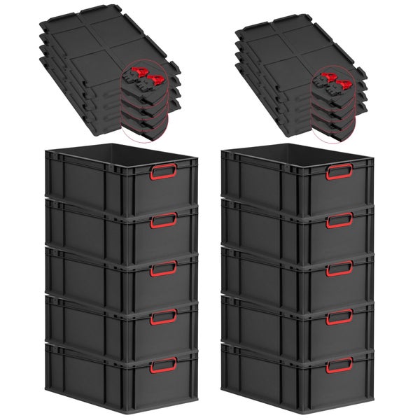 PROREGAL SuperSparSet 10x Eurobox NextGen Color mit Scharnierdeckel und Schiebeschnappverschlüssen, HxBxT 22x40x60cm, 44 Liter, Schwarz, Griffe rot geschlossen, Verstärkter Boden, Eurobehälter, Transportbox, Transportbehälter, Stapelbehälter