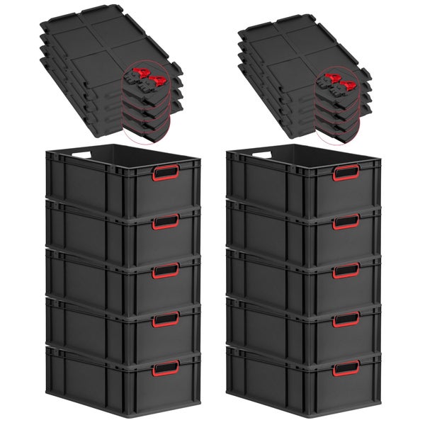 PROREGAL SuperSparSet 10x Eurobox NextGen Color mit Scharnierdeckel und Schiebeschnappverschlüssen, HxBxT 22x40x60cm, 44 Liter, Schwarz, Griffe rot offen, Verstärkter Boden, Eurobehälter, Transportbox, Transportbehälter, Stapelbehälter