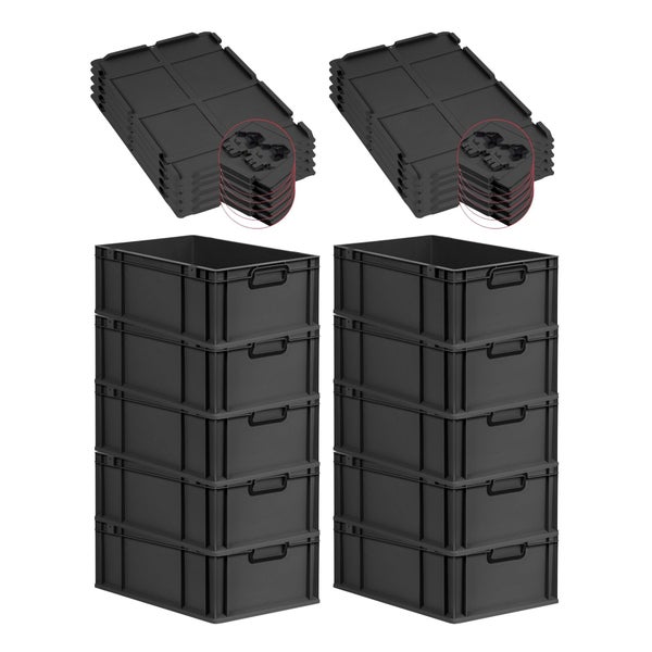 PROREGAL SuperSparSet 10x Eurobox NextGen Color mit Scharnierdeckel und Schiebeschnappverschlüssen, HxBxT 22x40x60cm, 44 Liter, Schwarz, Griffe schwarz geschlossen, Verstärkter Boden, Eurobehälter, Transportbox, Transportbehälter, Stapelbehälter