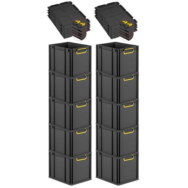 PROREGAL SuperSparSet 10x Eurobox NextGen Color mit Scharnierdeckel und Schiebeschnappverschlüssen, HxBxT 32x30x40cm, 30 Liter, Schwarz, Griffe gelb geschlossen, Eurobehälter, Transportbox, Transportbehälter, Stapelbehälter