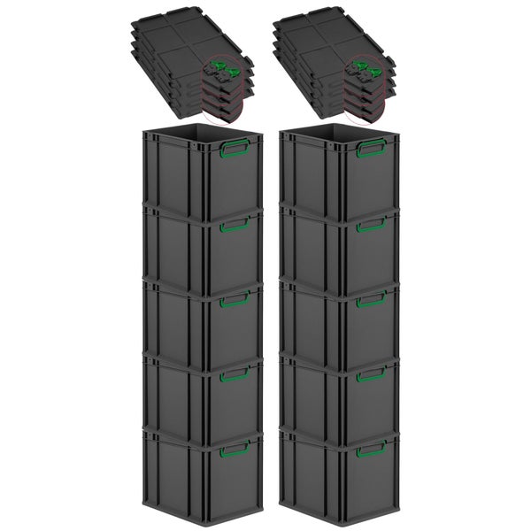 PROREGAL SuperSparSet 10x Eurobox NextGen Color mit Scharnierdeckel und Schiebeschnappverschlüssen, HxBxT 32x30x40cm, 30 Liter, Schwarz, Griffe grün geschlossen, Eurobehälter, Transportbox, Transportbehälter, Stapelbehälter