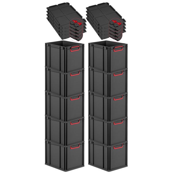 PROREGAL SuperSparSet 10x Eurobox NextGen Color mit Scharnierdeckel und Schiebeschnappverschlüssen, HxBxT 32x30x40cm, 30 Liter, Schwarz, Griffe rot geschlossen, Eurobehälter, Transportbox, Transportbehälter, Stapelbehälter