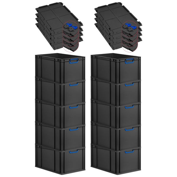 PROREGAL SuperSparSet 10x Eurobox NextGen Color mit Scharnierdeckel und Schiebeschnappverschlüssen, HxBxT 32x40x60cm, 65 Liter, Schwarz, Griffe blau geschlossen, Verstärkter Boden, Eurobehälter, Transportbox, Transportbehälter, Stapelbehälter