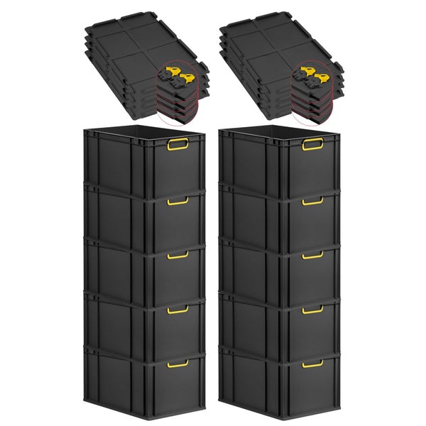 PROREGAL SuperSparSet 10x Eurobox NextGen Color mit Scharnierdeckel und Schiebeschnappverschlüssen, HxBxT 32x40x60cm, 65 Liter, Schwarz, Griffe gelb geschlossen, Verstärkter Boden, Eurobehälter, Transportbox, Transportbehälter, Stapelbehälter