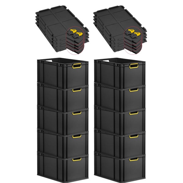 PROREGAL SuperSparSet 10x Eurobox NextGen Color mit Scharnierdeckel und Schiebeschnappverschlüssen, HxBxT 32x40x60cm, 65 Liter, Schwarz, Griffe gelb offen, Verstärkter Boden, Eurobehälter, Transportbox, Transportbehälter, Stapelbehälter