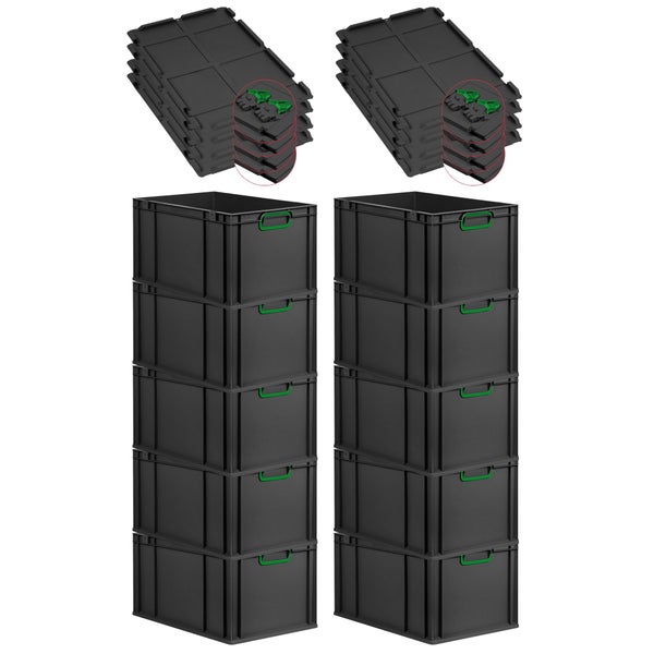 PROREGAL SuperSparSet 10x Eurobox NextGen Color mit Scharnierdeckel und Schiebeschnappverschlüssen, HxBxT 32x40x60cm, 65 Liter, Schwarz, Griffe grün geschlossen, Verstärkter Boden, Eurobehälter, Transportbox, Transportbehälter, Stapelbehälter