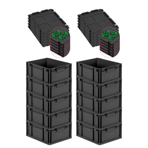 PROREGAL SuperSparSet 10x Eurobox NextGen Grip mit Auflagedeckel inkl. 4 grünen Schiebeschnappverschlüssen, HxBxT 17x30x40cm, 16 Liter, Schwarz, Griffe geschlossen, Eurobehälter, Transportbox, Transportbehälter, Stapelbehälter