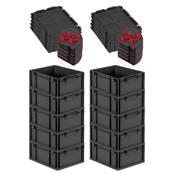 PROREGAL SuperSparSet 10x Eurobox NextGen Grip mit Auflagedeckel inkl. 4 roten Schiebeschnappverschlüssen, HxBxT 17x30x40cm, 16 Liter, Schwarz, Griffe geschlossen, Eurobehälter, Transportbox, Transportbehälter, Stapelbehälter
