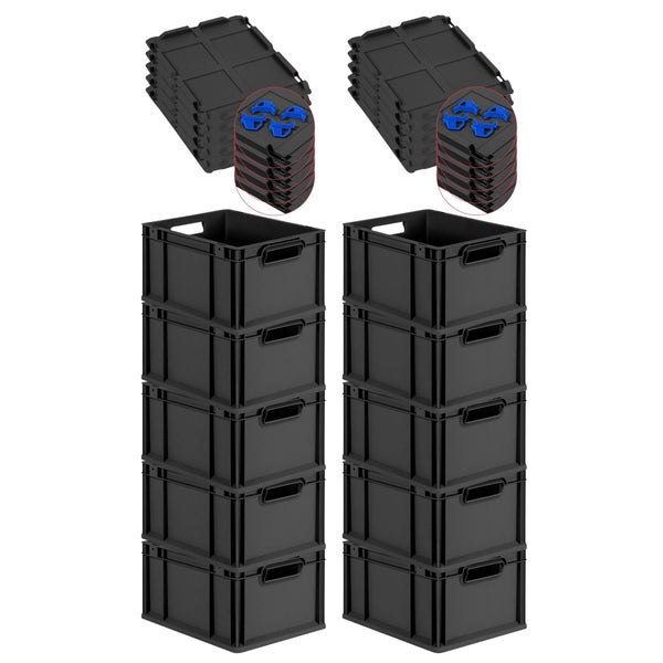 PROREGAL SuperSparSet 10x Eurobox NextGen Grip mit Scharnierdeckel und blauen Schiebeschnappverschlüssen, HxBxT 22x30x40cm, 20 Liter, Schwarz, Griffe offen, Eurobehälter, Transportbox, Transportbehälter, Stapelbehälter