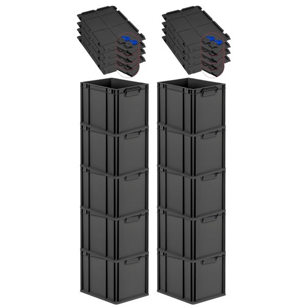 PROREGAL SuperSparSet 10x Eurobox NextGen Grip mit Scharnierdeckel und blauen Schiebeschnappverschlüssen, HxBxT 32x30x40cm, 30 Liter, Schwarz, Griffe geschlossen, Eurobehälter, Transportbox, Transportbehälter, Stapelbehälter