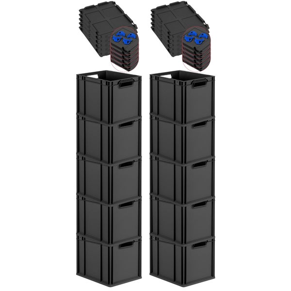 PROREGAL SuperSparSet 10x Eurobox NextGen Grip mit Scharnierdeckel und blauen Schiebeschnappverschlüssen, HxBxT 32x30x40cm, 30 Liter, Schwarz, Griffe offen, Eurobehälter, Transportbox, Transportbehälter, Stapelbehälter