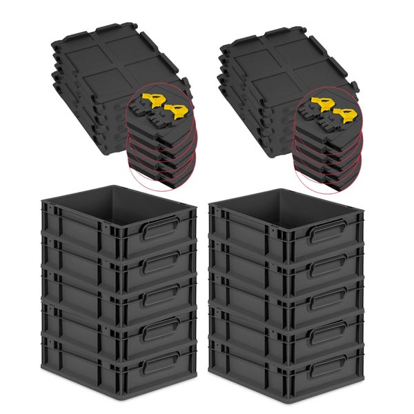 PROREGAL SuperSparSet 10x Eurobox NextGen Grip mit Scharnierdeckel und gelben Schiebeschnappverschlüssen, HxBxT 12x30x40cm, 11 Liter, Schwarz, Griffe geschlossen, Eurobehälter, Transportbox, Transportbehälter, Stapelbehälter