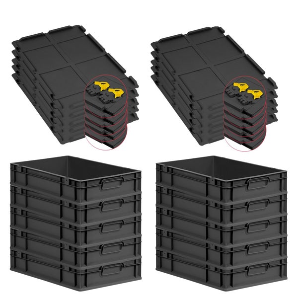 PROREGAL SuperSparSet 10x Eurobox NextGen Grip mit Scharnierdeckel und gelben Schiebeschnappverschlüssen, HxBxT 12x40x60cm, 23 Liter, Schwarz, Griffe geschlossen, Eurobehälter, Transportbox, Transportbehälter, Stapelbehälter