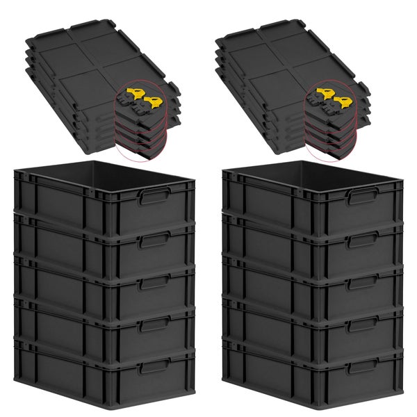 PROREGAL SuperSparSet 10x Eurobox NextGen Grip mit Scharnierdeckel und gelben Schiebeschnappverschlüssen, HxBxT 17x40x60cm, 34 Liter, Schwarz, Griffe geschlossen, Eurobehälter, Transportbox, Transportbehälter, Stapelbehälter