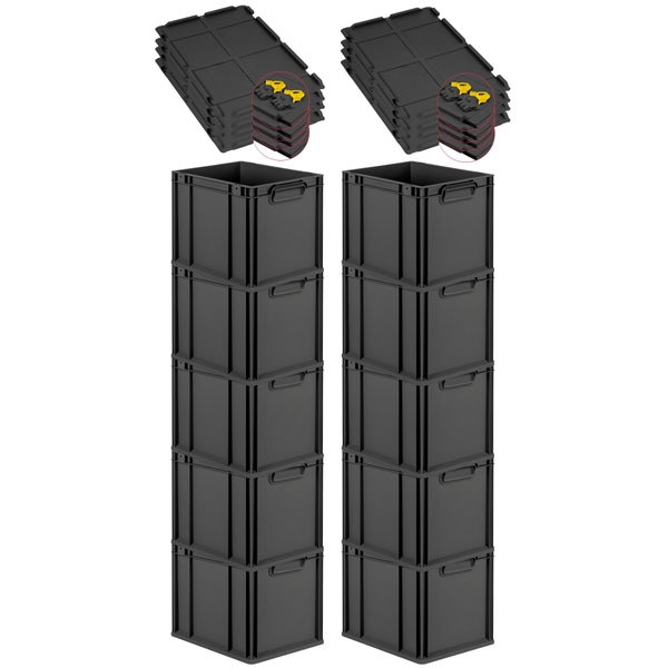 PROREGAL SuperSparSet 10x Eurobox NextGen Grip mit Scharnierdeckel und gelben Schiebeschnappverschlüssen, HxBxT 32x30x40cm, 30 Liter, Schwarz, Griffe geschlossen, Eurobehälter, Transportbox, Transportbehälter, Stapelbehälter