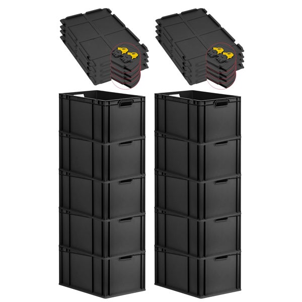 PROREGAL SuperSparSet 10x Eurobox NextGen Grip mit Scharnierdeckel und gelben Schiebeschnappverschlüssen, HxBxT 32x40x60cm, 65 Liter, Schwarz, Griffe offen, Verstärkter Boden, Eurobehälter, Transportbox, Transportbehälter, Stapelbehälter
