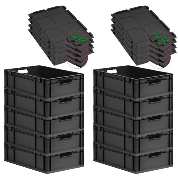 PROREGAL SuperSparSet 10x Eurobox NextGen Grip mit Scharnierdeckel und grünen Schiebeschnappverschlüssen, HxBxT 17x40x60cm, 34 Liter, Schwarz, Griffe offen, Eurobehälter, Transportbox, Transportbehälter, Stapelbehälter