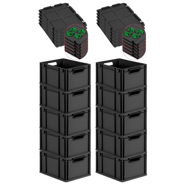 PROREGAL SuperSparSet 10x Eurobox NextGen Grip mit Scharnierdeckel und grünen Schiebeschnappverschlüssen, HxBxT 22x30x40cm, 20 Liter, Schwarz, Griffe offen, Eurobehälter, Transportbox, Transportbehälter, Stapelbehälter