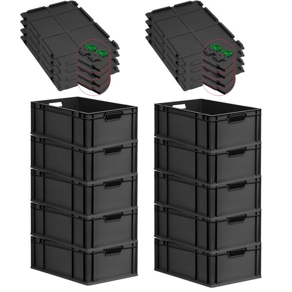 PROREGAL SuperSparSet 10x Eurobox NextGen Grip mit Scharnierdeckel und grünen Schiebeschnappverschlüssen, HxBxT 22x40x60cm, 44 Liter, Schwarz, Griffe offen, Verstärkter Boden, Eurobehälter, Transportbox, Transportbehälter, Stapelbehälter