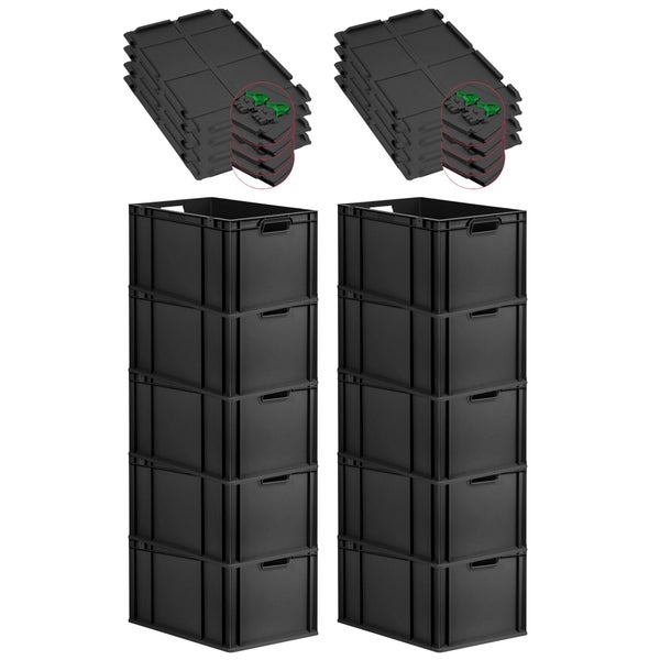 PROREGAL SuperSparSet 10x Eurobox NextGen Grip mit Scharnierdeckel und grünen Schiebeschnappverschlüssen, HxBxT 32x40x60cm, 65 Liter, Schwarz, Griffe offen, Verstärkter Boden, Eurobehälter, Transportbox, Transportbehälter, Stapelbehälter
