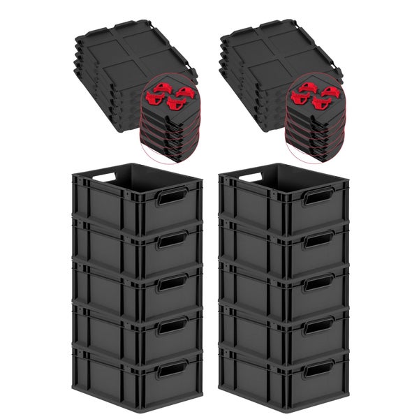 PROREGAL SuperSparSet 10x Eurobox NextGen Grip mit Scharnierdeckel und roten Schiebeschnappverschlüssen, HxBxT 17x30x40cm, 16 Liter, Schwarz, Griffe offen, Eurobehälter, Transportbox, Transportbehälter, Stapelbehälter