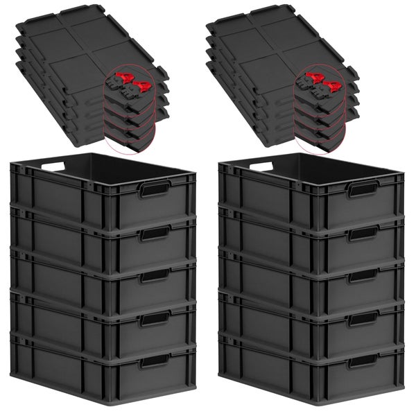 PROREGAL SuperSparSet 10x Eurobox NextGen Grip mit Scharnierdeckel und roten Schiebeschnappverschlüssen, HxBxT 17x40x60cm, 34 Liter, Schwarz, Griffe offen, Eurobehälter, Transportbox, Transportbehälter, Stapelbehälter