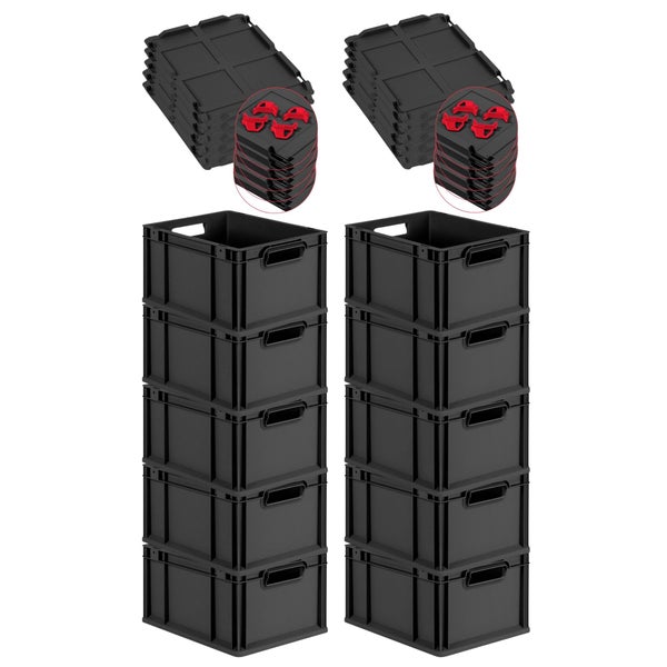 PROREGAL SuperSparSet 10x Eurobox NextGen Grip mit Scharnierdeckel und roten Schiebeschnappverschlüssen, HxBxT 22x30x40cm, 20 Liter, Schwarz, Griffe offen, Eurobehälter, Transportbox, Transportbehälter, Stapelbehälter