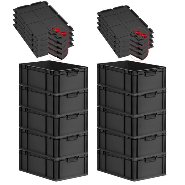PROREGAL SuperSparSet 10x Eurobox NextGen Grip mit Scharnierdeckel und roten Schiebeschnappverschlüssen, HxBxT 22x40x60cm, 44 Liter, Schwarz, Griffe geschlossen, Verstärkter Boden, Eurobehälter, Transportbox, Transportbehälter, Stapelbehälter