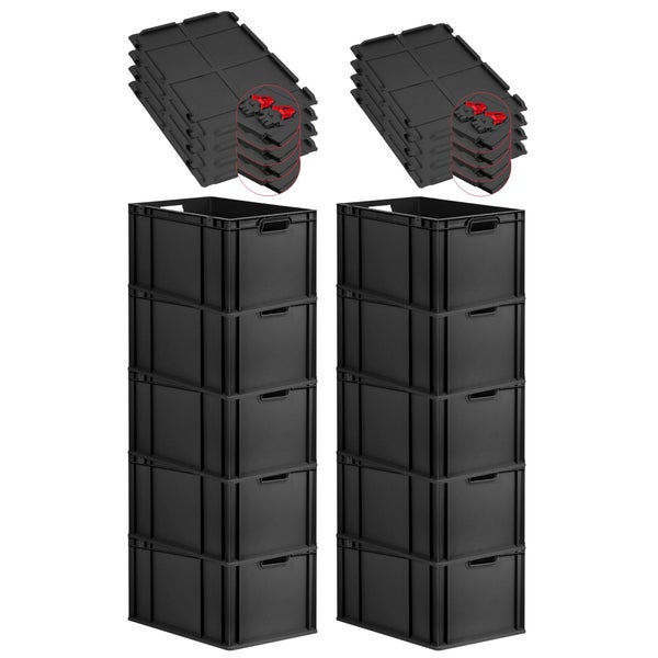 PROREGAL SuperSparSet 10x Eurobox NextGen Grip mit Scharnierdeckel und roten Schiebeschnappverschlüssen, HxBxT 32x40x60cm, 65 Liter, Schwarz, Griffe offen, Verstärkter Boden, Eurobehälter, Transportbox, Transportbehälter, Stapelbehälter