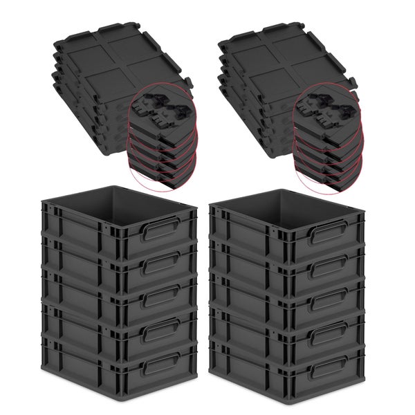 PROREGAL SuperSparSet 10x Eurobox NextGen Grip mit Scharnierdeckel und schwarzen Schiebeschnappverschlüssen, HxBxT 12x30x40cm, 11 Liter, Schwarz, Griffe geschlossen, Eurobehälter, Transportbox, Transportbehälter, Stapelbehälter