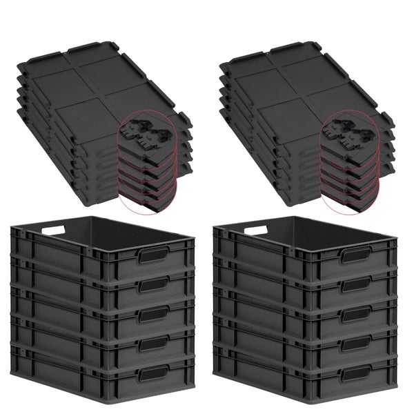 PROREGAL SuperSparSet 10x Eurobox NextGen Grip mit Scharnierdeckel und schwarzen Schiebeschnappverschlüssen, HxBxT 12x40x60cm, 23 Liter, Schwarz, Griffe offen, Eurobehälter, Transportbox, Transportbehälter, Stapelbehälter