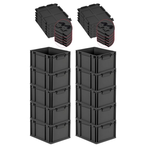 PROREGAL SuperSparSet 10x Eurobox NextGen Grip mit Scharnierdeckel und schwarzen Schiebeschnappverschlüssen, HxBxT 22x30x40cm, 20 Liter, Schwarz, Griffe geschlossen, Eurobehälter, Transportbox, Transportbehälter, Stapelbehälter