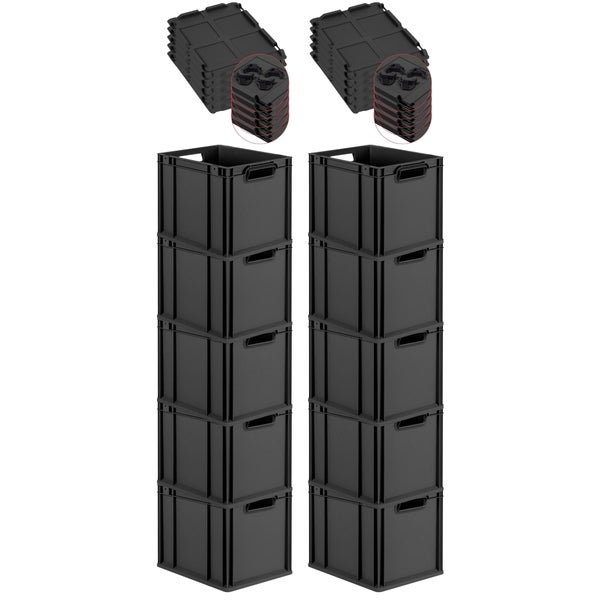 PROREGAL SuperSparSet 10x Eurobox NextGen Grip mit Scharnierdeckel und schwarzen Schiebeschnappverschlüssen, HxBxT 32x30x40cm, 30 Liter, Schwarz, Griffe offen, Eurobehälter, Transportbox, Transportbehälter, Stapelbehälter