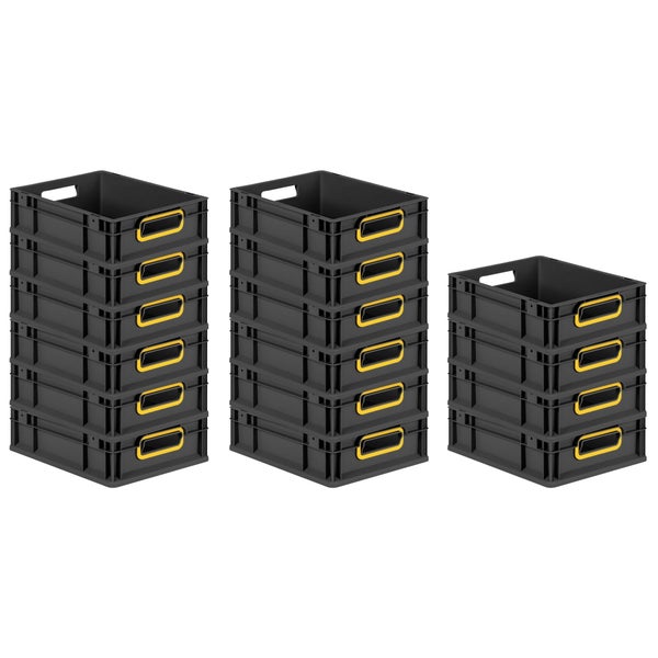 PROREGAL SuperSparSet 16x Eurobox NextGen Color, HxBxT 12x30x40cm, 11 Liter, Griffe gelb offen, Schwarz, Eurobehälter, Transportbox, Transportbehälter, Stapelbehälter