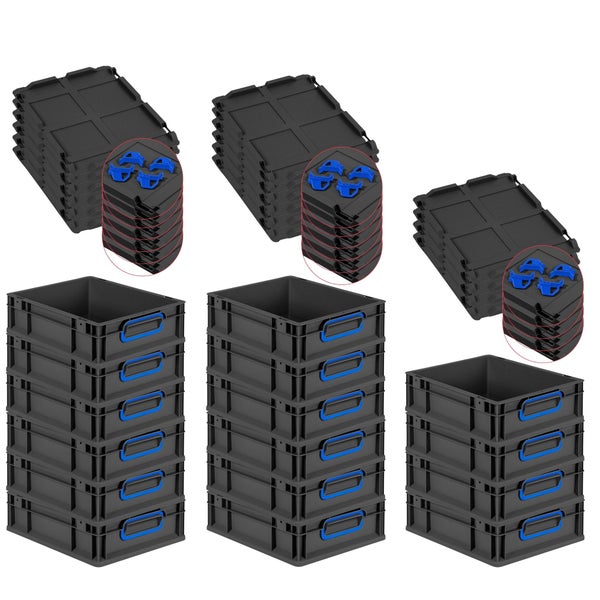 PROREGAL SuperSparSet 16x Eurobox NextGen Color mit Auflagedeckel und Schiebeschnappverschlüsse, HxBxT 12x30x40cm, 11 Liter, Schwarz, Griffe blau geschlossen, Eurobehälter, Transportbox, Transportbehälter, Stapelbehälter