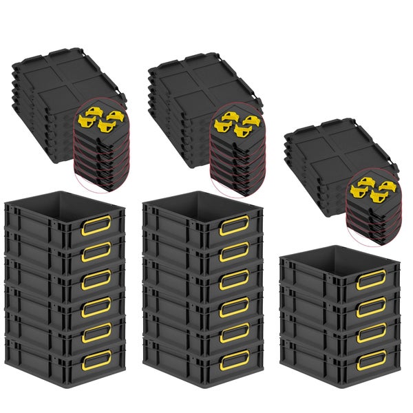 PROREGAL SuperSparSet 16x Eurobox NextGen Color mit Auflagedeckel und Schiebeschnappverschlüsse, HxBxT 12x30x40cm, 11 Liter, Schwarz, Griffe gelb geschlossen, Eurobehälter, Transportbox, Transportbehälter, Stapelbehälter