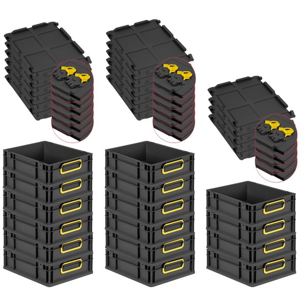 PROREGAL SuperSparSet 16x Eurobox NextGen Color mit Scharnierdeckel und Schiebeschnappverschlüssen, HxBxT 12x30x40cm, 11 Liter, Schwarz, Griffe gelb geschlossen, Eurobehälter, Transportbox, Transportbehälter, Stapelbehälter