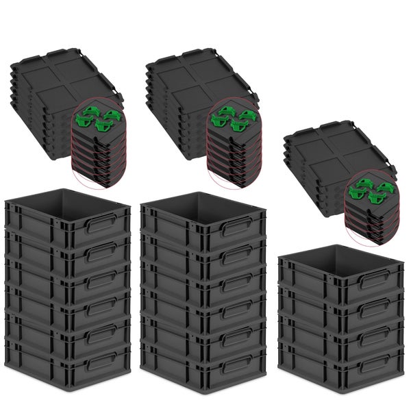 PROREGAL SuperSparSet 16x Eurobox NextGen Grip mit Auflagedeckel inkl. 4 grünen Schiebeschnappverschlüssen, HxBxT 12x30x40cm, 11 Liter, Schwarz, Griffe geschlossen, Eurobehälter, Transportbox, Transportbehälter, Stapelbehälter