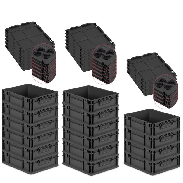 PROREGAL SuperSparSet 16x Eurobox NextGen Grip mit Auflagedeckel inkl. 4 schwarzen Schiebeschnappverschlüssen, HxBxT 12x30x40cm, 11 Liter, Schwarz, Griffe geschlossen, Eurobehälter, Transportbox, Transportbehälter, Stapelbehälter