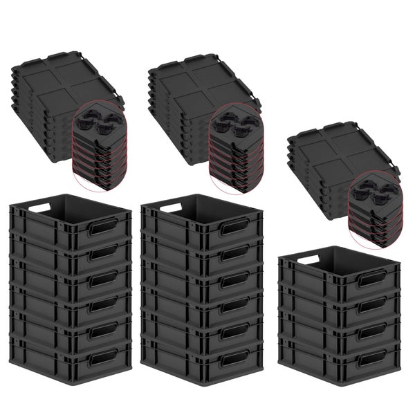 PROREGAL SuperSparSet 16x Eurobox NextGen Grip mit Auflagedeckel inkl. 4 schwarzen Schiebeschnappverschlüssen, HxBxT 12x30x40cm, 11 Liter, Schwarz, Griffe offen, Eurobehälter, Transportbox, Transportbehälter, Stapelbehälter