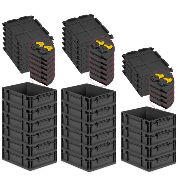 PROREGAL SuperSparSet 16x Eurobox NextGen Grip mit Scharnierdeckel und gelben Schiebeschnappverschlüssen, HxBxT 12x30x40cm, 11 Liter, Schwarz, Griffe geschlossen, Eurobehälter, Transportbox, Transportbehälter, Stapelbehälter