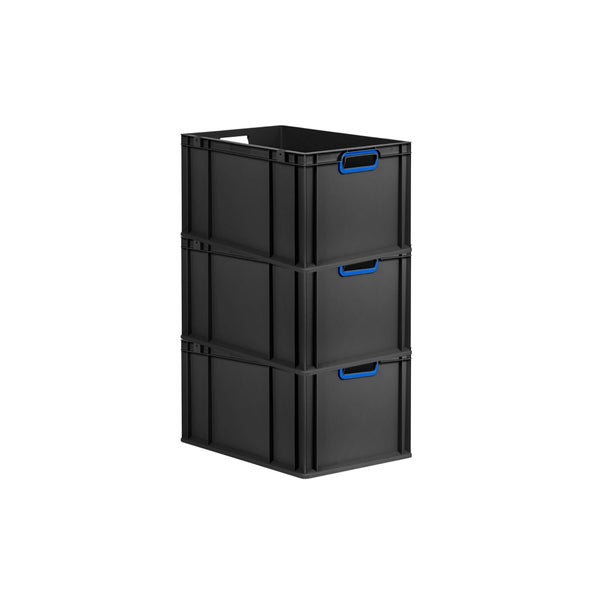 PROREGAL SuperSparSet 3x Eurobox NextGen Color, HxBxT 32x40x60cm, 65 Liter, Griffe blau offen, Verstärkter Boden, Schwarz, Eurobehälter, Transportbox, Transportbehälter, Stapelbehälter