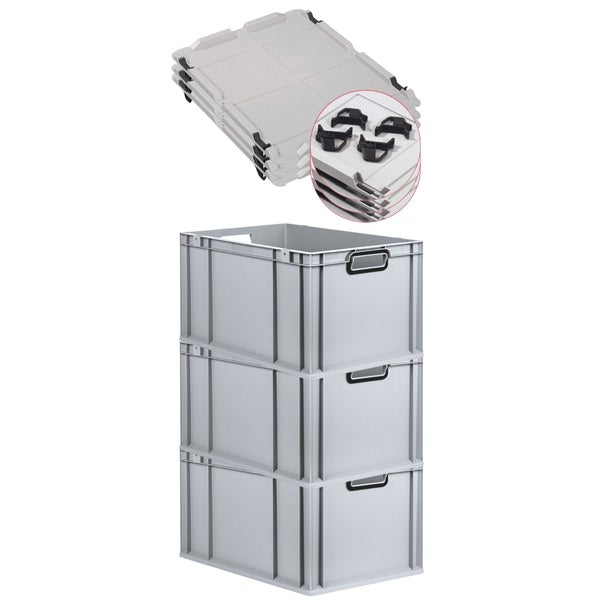 PROREGAL SuperSparSet 3x Eurobox NextGen Color mit Auflagedeckel und Schiebeschnappverschlüsse, HxBxT 32x40x60cm, 65 Liter, Grau, Griffe schwarz offen, Verstärkter Boden, Eurobehälter, Transportbox, Transportbehälter, Stapelbehälter